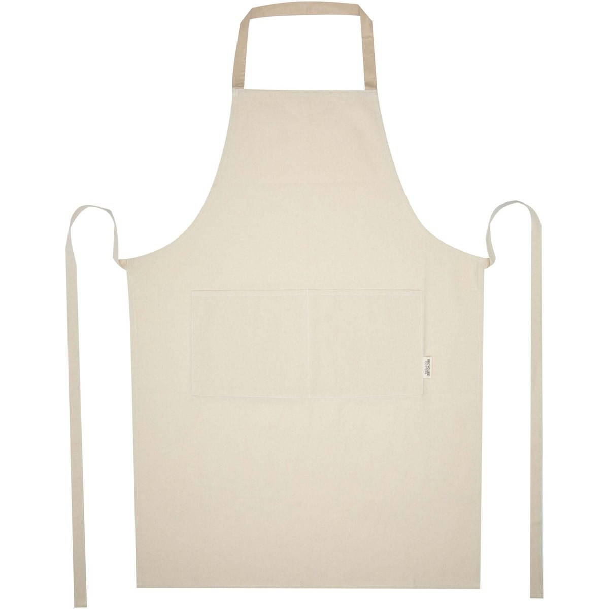 The Nia apron is crafted from 100% GRS certified 200 g/m² recycled cotton. With its natural cotton colour and contrasted neck loop, this apron will protect your clothes during your cooking session. Featuring two adjacent pockets with a combined size of 45 x 20 cm and a 1-metre long tie-back closure, the Nia apron ensures both practicality and style in your kitchen endeavours.